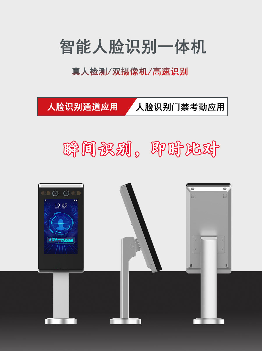 1、全新壁挂式工业级设计, 性能稳定,典雅大方,线条流畅; 2、采用7英寸LCD触摸显示屏,屏幕比例16:9,屏幕分辨率1024*600,显示软件界面及操作提示,显示人脸框,实时检测最大人脸,方便用户校准; 3、采用200万广角宽动态摄像头,面部识别距离0.3m-1m,适应1.4m—1.9m身高范围; 4、设备采用深度算法,支持3千人脸库/2万人脸库,识别速度快,准确率更高; 5、支持真人活体检测,照片视频防假识别; 6、不惧逆光、强光、下雨、下雪等环境影响,在恶劣环境下也能识别; 7、设备支持人脸识别、刷卡+人脸识别等多种识别方式,人脸比对时间≤0.5/人,人脸验证准确率≥99%; 8、设备支持通过TCP/IP一卡通平台下发、人脸数据,支持在断网模式下,单机运行功能; 9、设备支持数据网络上传功能,可将设备比对结果实时上传给一卡通平台保存; 10、设备支持本地登录后管理、查询、设置设备参数,可通过U盘进行数据导入; 11、设备支持通过韦根接口接通道管理板; 12、设备可输出认证结果固定语音提示; 13、设备支持看门狗守护机制,保障设备运行稳定性。